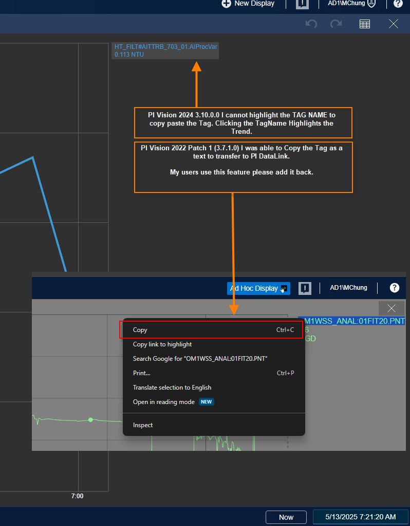 In PI Vision 2022, copying tag names directly from the interface was straightforward and supported this workflow seamlessly. However, that functionality appears to be missing or restricted in the current version. From a usability standpoint, this is unexpected—virtually every modern search or visualization tool allows users to copy text elements easily. PI Vision serves as a key search and discovery tool for our operations data, so limiting the ability to copy tag names reduces its effectiveness.